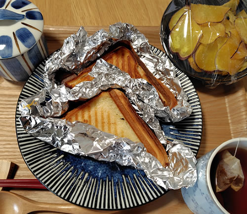 その日の夜勤スタッフは、夜中におさつチップスを作り、翌朝にホットサンドを提供。