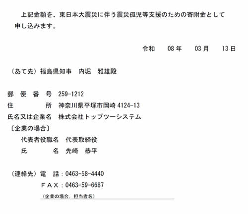 弊社も未来の福島を支える子どもたちにと微力ながら寄付をしました。